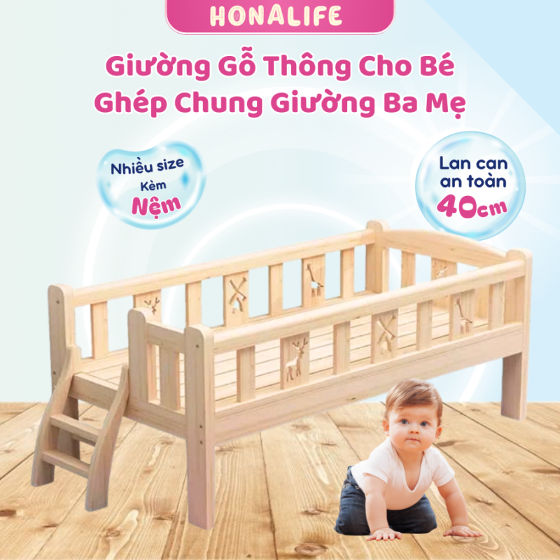 GIƯỜNG GỖ THÔNG CHO BÉ GHÉP ĐÔI VỚI GIƯỜNG BA MẸ
