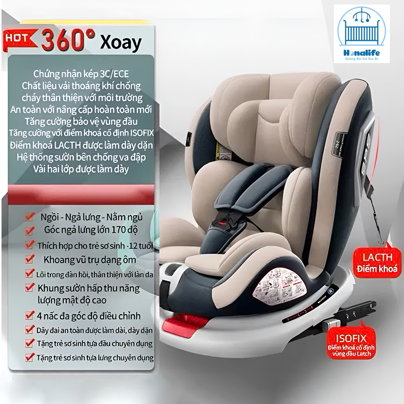 Ghế ngồi ô tô HONA189 kích thước lớn cho bé 0–12 tuổi đạt tiêu chuẩn Châu Âu